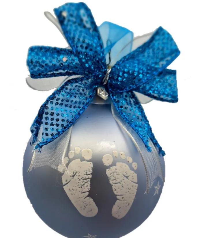 Glass Ornament, Mon Premier Noel 2023 Souvenir, Hand Decorated. Light Blue Ball With White Lettering. Baby Feet Print On Reverse Side