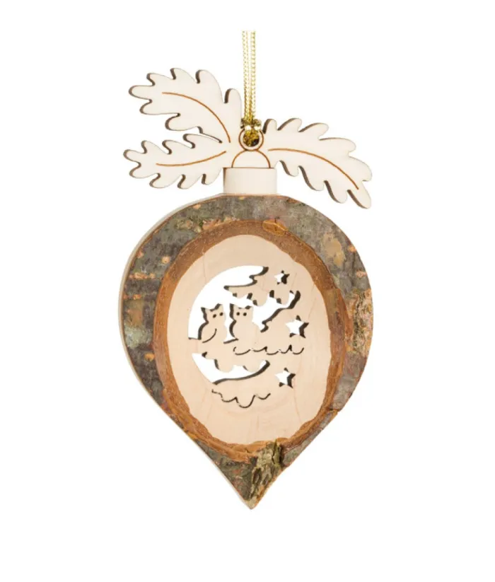 German Wooden Ornament, Raindrop Shape With Oak Leaves, Owls In Pine Tree, Engraving, 9Cm