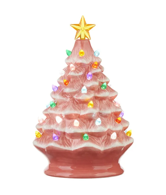 Boutique de Noël Ginger Bread & Candy Shoppe*Table Top Decoration, Illuminated (Led) Pink Ceramic Xmas Tree, Measures 8″