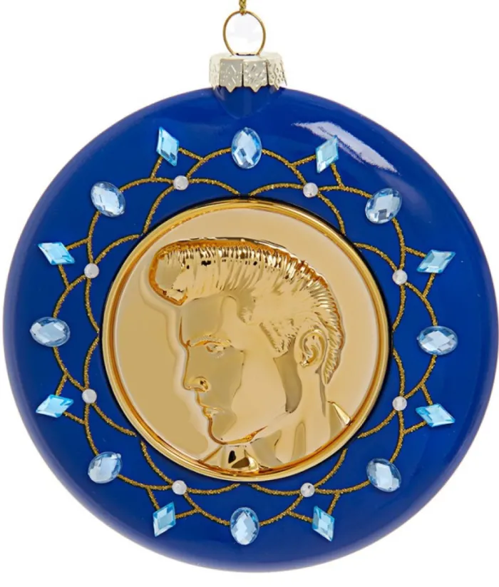 Glass Ornament, Gold And Blue Disc With Elvis’ Likeness, Measures 100Mm