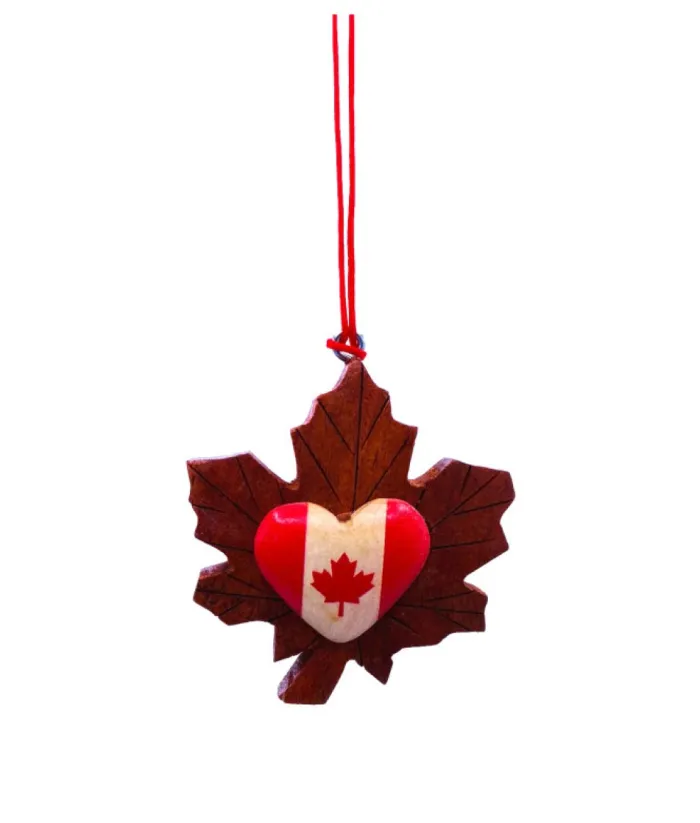 Boutique de Noël Rustic*Ornament, Wooden Maple Leaf With Heart Shaped Canada Flag