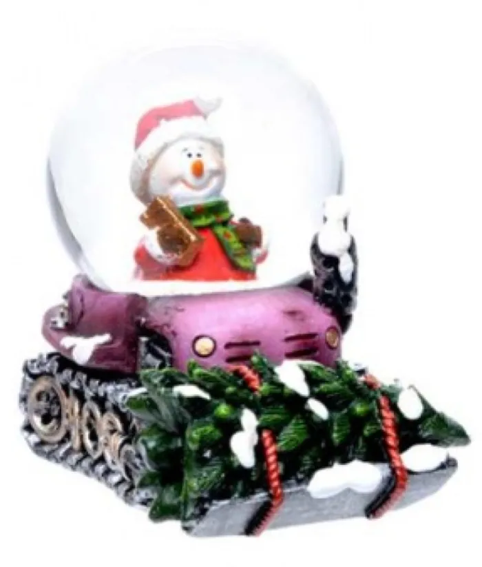 Snowman On Pink Snowmobile Mini-Snowglobe. Made Of Glass And Resin.
